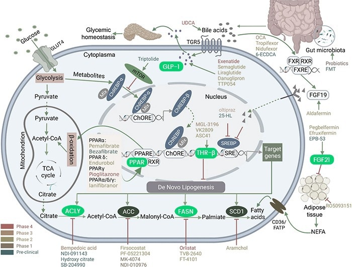 Clinical trials of the THR-β agonist Resmetirom have shown promising results for treating NASH. Ongoing research is also exploring FASN inhibitors to reduce lipids, NR1H4/FXR agonists to address bile acid-related injuries, GLP-1R agonists to improve insulin sensitivity, and FGF19/FGF21 analogs to reduce hepatic steatosis.  ACLY inhibitors also show potential in NASH treatment.