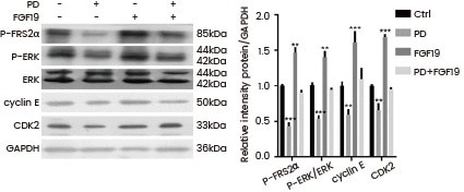 HepG2 cells were treated with FGF19 (Cat#: 12226-HNAE, Sino Biological) and/or PD and then P-FRS2α, P-ERK, cyclin E, and CDK2 protein levels were analyzed by Western blot.