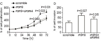 OVCAR3 cells were cultured with recombinant FGF19 (Sino Biological). Cell proliferation was evaluated using the MTT assay (C), and cell invasion was detected using the Matrigel assay (D).