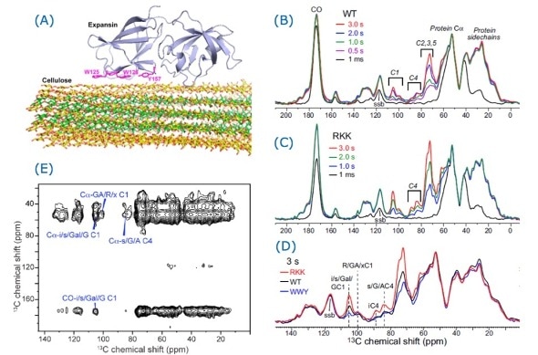 Fig. 3. (A) Graphic depicting expansin binding to plant cell walls. WT (B) and RKK mutant (C) spin diffusion spectra showing the buildup of signals from the protein to the cell-wall polysaccharides. (D) Comparison of signals transferred from the WT and two mutants to the plant cell walls. (E) 2D 13C-13C spectrum showing direct evidence of protein-polysaccharide correlations through spin diffusion.