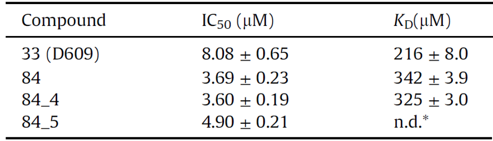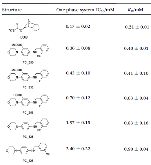 The Amplex Red biochemical assay was used to test the virtual hits. IC50 values were derived for the best hits, and these were verified using the intrinsic tryptophan fluorescence assay (KD). The best hit series was of 2-Morpholinobenzoic acids (84).
