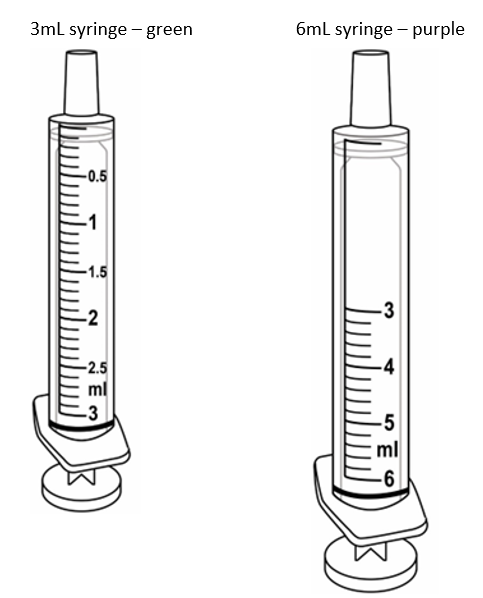 and two purple 6 mL syringes with 0.2 mL graduations and the medicine bottle, either: