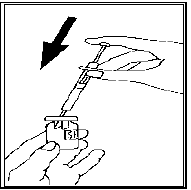 Remove the protective cap from the solvent vial. Attach the needle for reconstitution (the bigger needle) to the syringe and draw up some air into the syringe by pulling the plunger to approximately the 1 mL mark. Then insert the needle into the vial, push the plunger to expel the air, turn the vial upside down and gently draw up all the solvent.