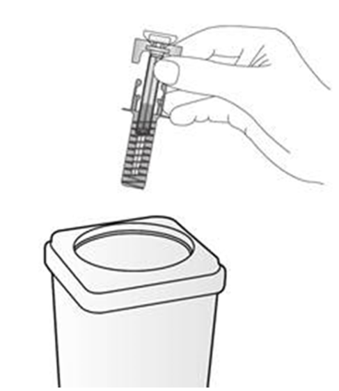 Put the used pre-filled syringe in a sharps disposal container (i.e. a puncture-resistant closable container, or similar) immediately after use.