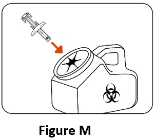 Throw away the used syringe into a sharps container (Figure M) right away.