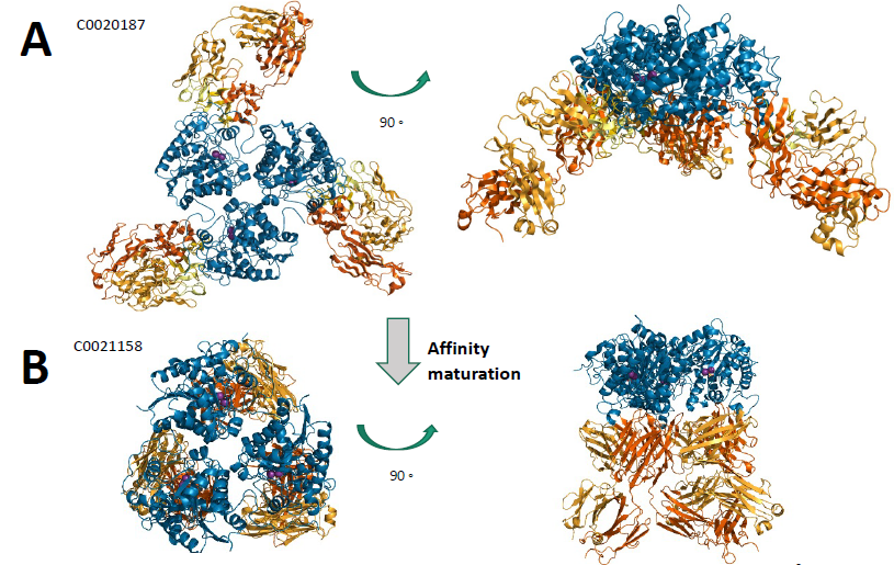 Figure 1. Co-crystal structure of the Fab in complex with trimeric ARG2. A) C0020187 (PDB 6SS5 – 1.7 Å) (B) C0021158 (PDB 6SS2 –2.4 Å).
