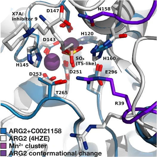 Fab C0021158 binding rotates Arg39 into the active site of ARG2.