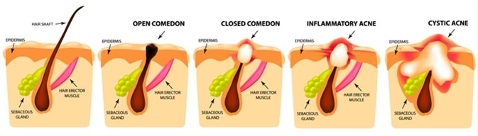 The surface of the skin is populated with sebaceous glands, which are attached to hair follicles. Typically, the glands produce a lubricant called sebum to prevent the skin from drying out. Hormonal changes can increase the amounts of oil produced. This increased oil, in combination with dead skin cells, can block follicles and result in the typical spotting.