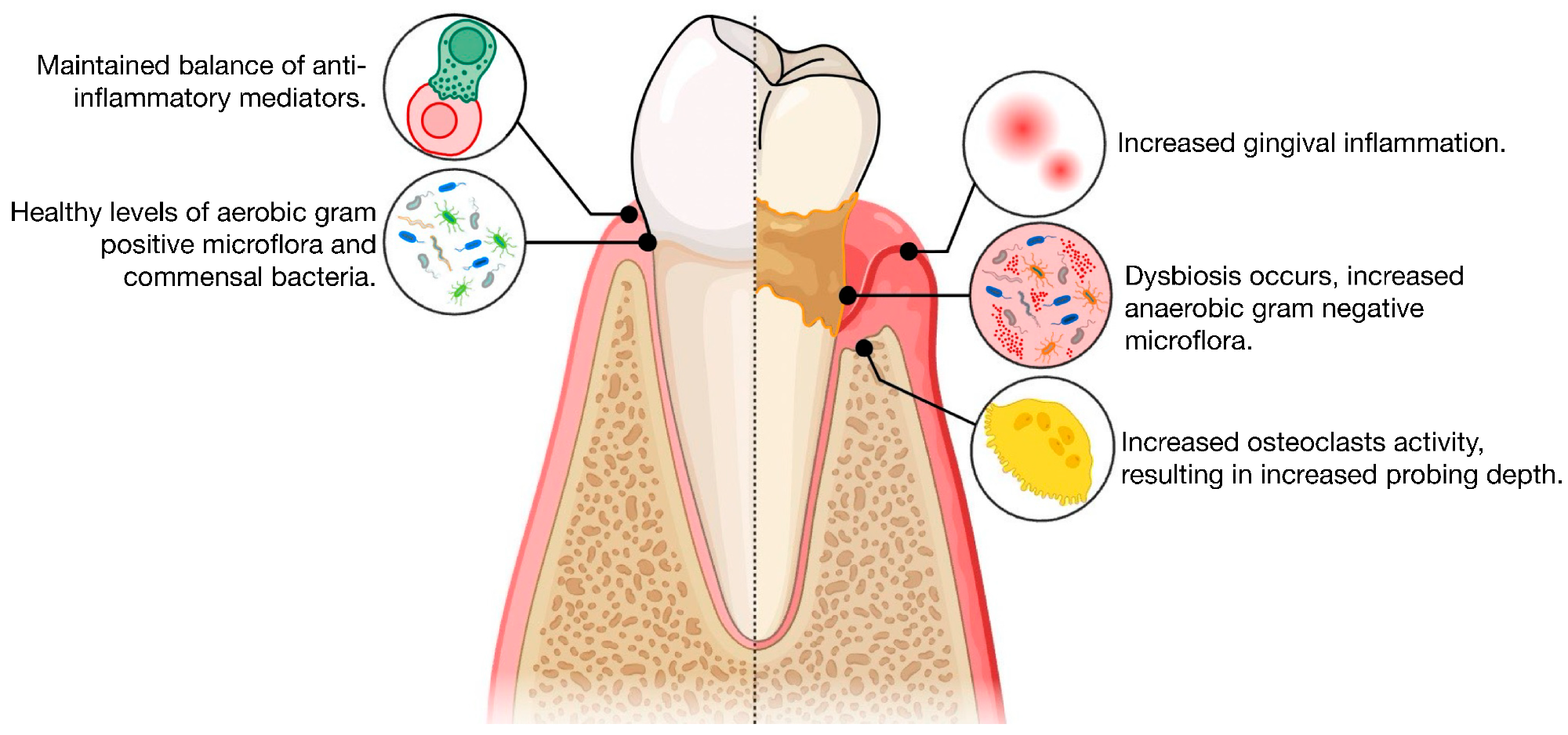 Illustration of the pathogenesis of periodontitis, comparing health with periodontitis.