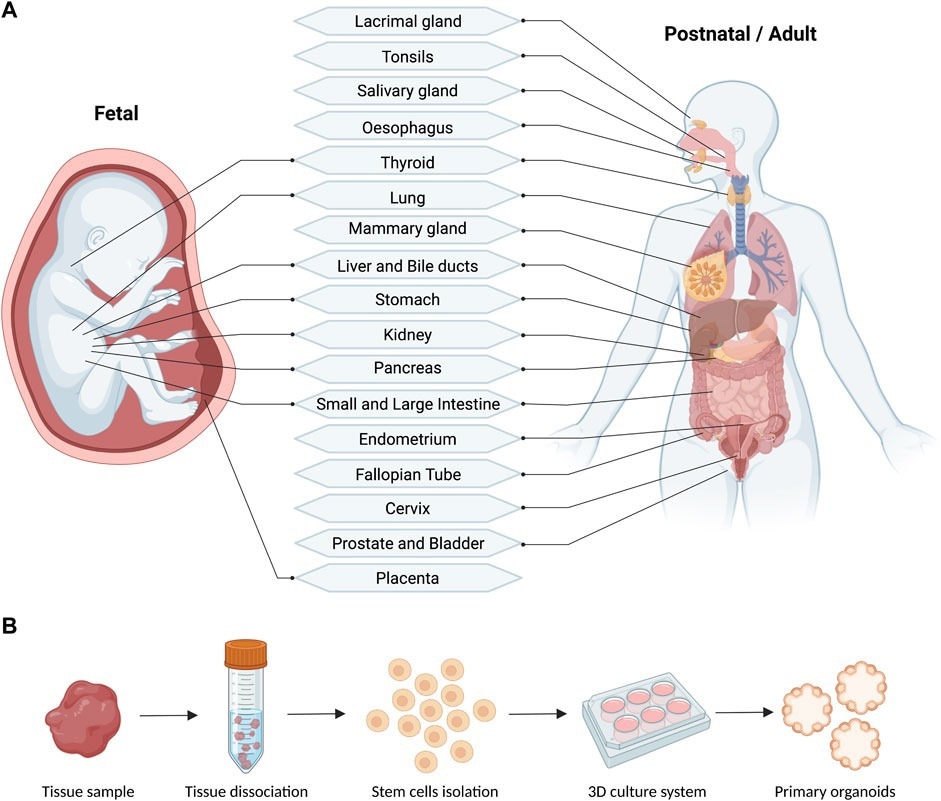 Schematic (A) and workflow (B) of the reported fetal and postnatal/adult tissues used for the derivation of primary human organoids (generated with BioRender).2