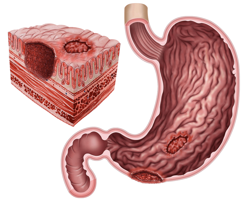 PUD has been strongly linked to infection with Helicobacter pylori. This bacterium is responsible for the destruction of protective mechanisms in the stomach and duodenum, which ultimately leads to damage of the organ by stomach acid that would otherwise not be a problem. These ulcers are found more commonly in the duodenum as compared to the stomach; however, both locations present with equal incidences of bleeding.