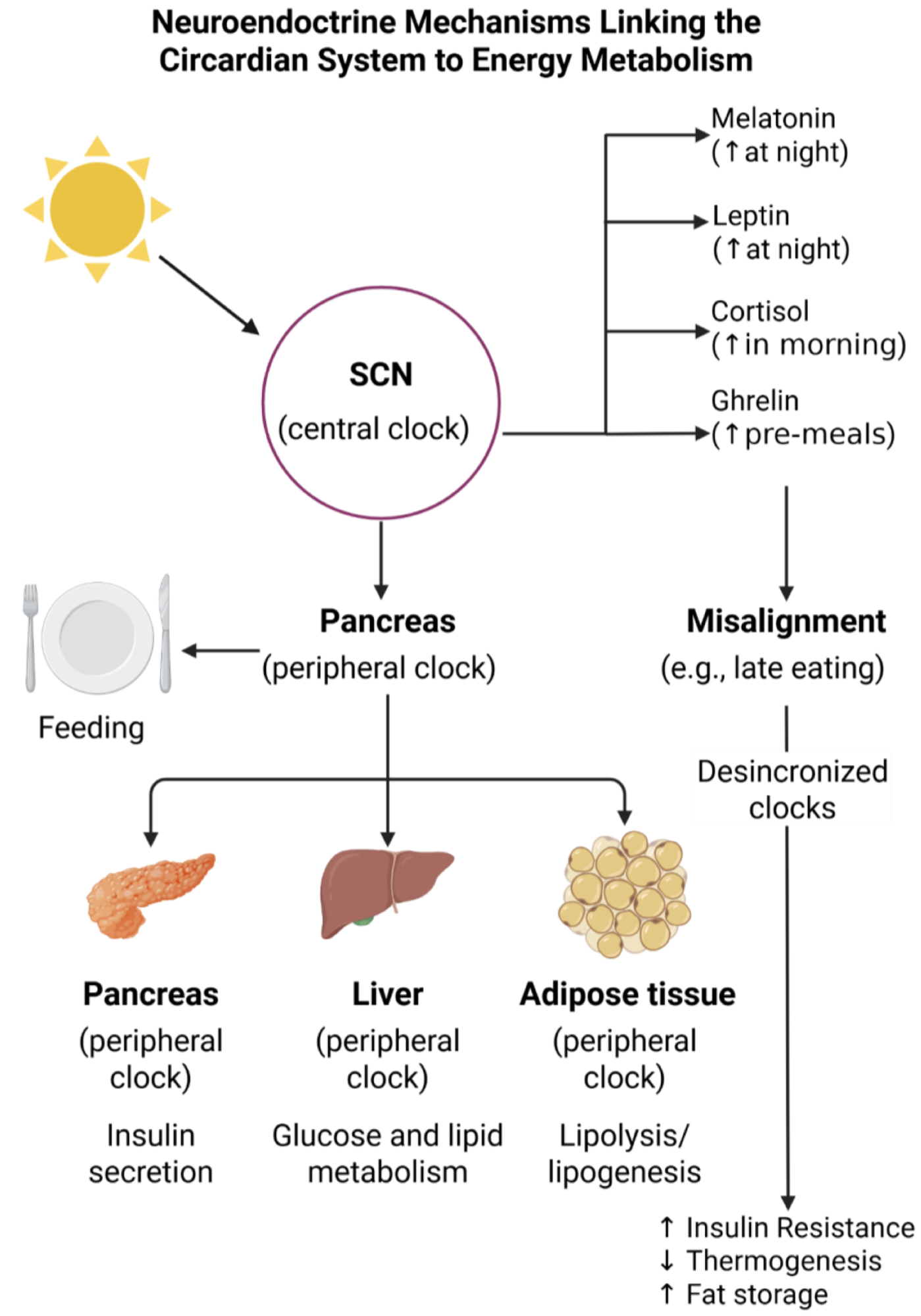 The circadian system comprises a central clock in the suprachiasmatic nucleus and multiple peripheral clocks in metabolic tissues. Together, these clocks coordinate 24-hour rhythms in glucose regulation, lipid metabolism, blood pressure, and hormonal activity.