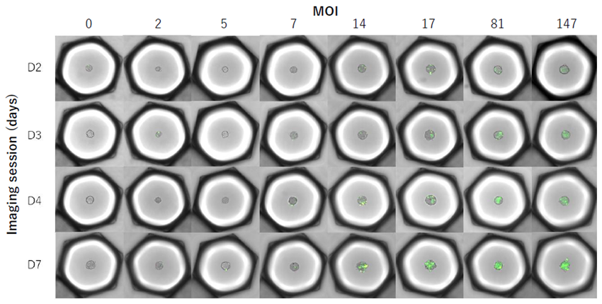 OKOMERA AI-Based Time-Lapse Overview of MCF7 spheroids across different MOIs. Increasing GFP Fluorescence in most of the spheroid area is observed with increasing MOI. Representative traps are shown over time, with GFP signal in green
