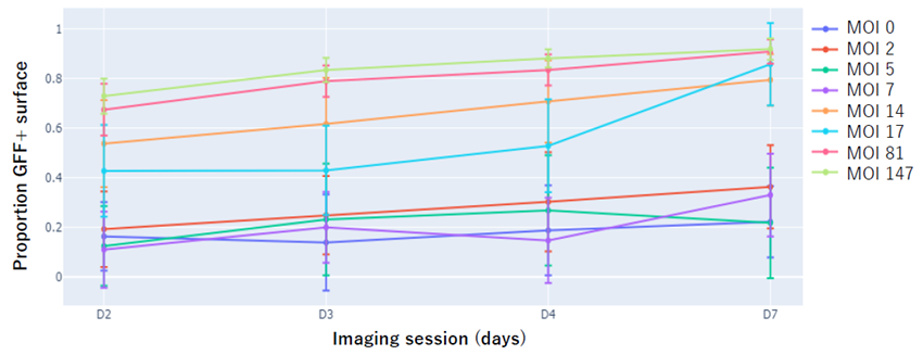 Figure 2. GFP-positive spheroid surface area. Represents the proportion of the spheroid surface showing GFP signal, indicating transduction efficiency. No significant GFP increase was observed below an MOI of 17, suggesting limited transduction at lower doses. GFP areas at MOI 81 and 147 were similar, indicating full transduction of cells at MOI 81 and above. Image Credit: Image courtesy of T Duboys et al., in partnership with ELRIG (UK) Ltd.