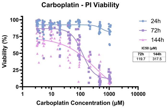 Dose-response curves for carboplatin treatment of MCF7 spheroids on a microfluidic chip. Cell viability at 24 h (blue), 72 h (purple), and 144 h (pink) showing time-dependent drug sensitivity. Viability was calculated as the ratio of spheroid area with PI signal above the death threshold to the total area