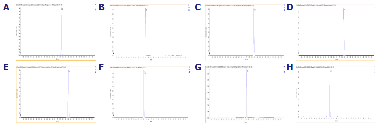 A: 4-MU. B: 4-MUS. C: 1-Naphthol. D: 1-Naphthol Sulfate. E: 17β-Estradiol. F: E2S. G: DHEA. H: DHEAS. The chromatograms of the analytes resolved by the established LC‐MS/MS methods. Image Credit: Pharmaron