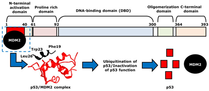 The mechanism of p53- and MDM2-binding. MDM2, indicated as black, binds to p53 at the N-terminal activation domain of p53, or the red area, to form p53/MDM2 complex.