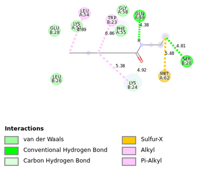 • Octanamide, n-(2-mercaptoethyl)- showed key interactions including hydrogen bonds (TRP B:23, GLU B:28, LYS B:24) and hydrophobic contacts within the p53-binding pocket. ( Figure 5)