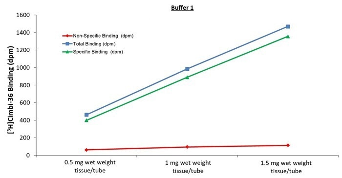 - Specific binding increased linearly with tissue concentration and was greater with buffer 1 (Figure 1) than with buffer 2 (Figure 2). Percentage [3H]cimbi-36 bound with buffer 1 was 8.2 %, 16 % and 23 % at 0.5, 1 and 1.5 mg wet weight tissue/tube, respectively.