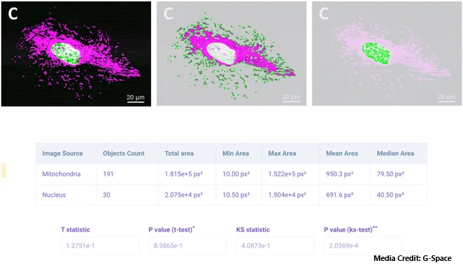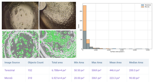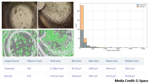 Representative outputs from G-SPACE degradation models and image/ video analytics applied to microgravity tissue studies (top and right). The company quantifies local and global morphological changes (e.g., density, synchronicity), computes correlations, and tracks the time evolution of cell differentiation and tissue maturity by measuring cell counts and total area on a daily basis.