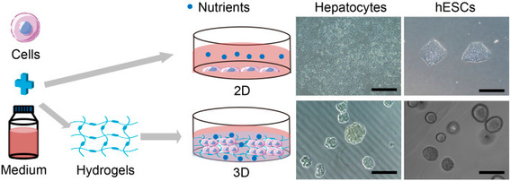 Comparison of hydrogel-based 3D cell culture and traditional 2D culture (Bar = 200 μm)