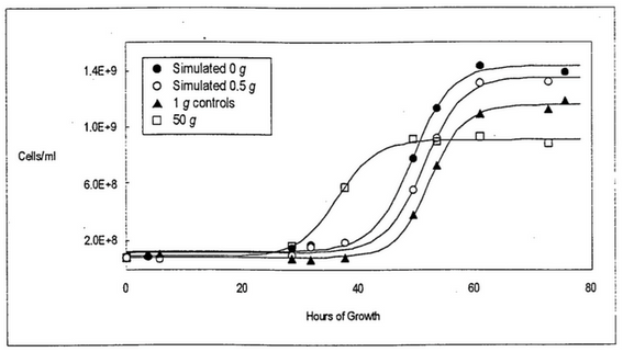 The figure illustrates the average cell densities and growth curves at various acceleration levels. "Simulated" 0 g was achieved using a horizontal clinostat, while 0.5 g was "simulated" using an inclined clinostat