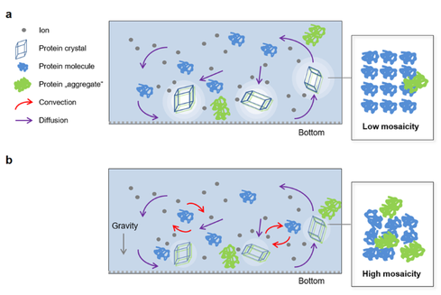 Figure 8a. Under microgravity conditions, 8b on earth and resulting effects on protein crystal quality/mosaicity are shown. Image Credit: Nature npj Microgravity, 2022