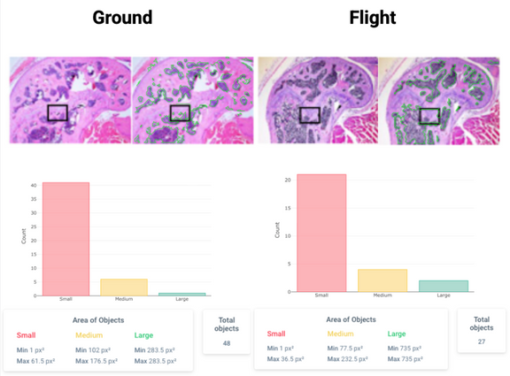 Delta-to-Gravity™ analytic scenario comparing protein crystal formation in ground vs. flight samples (right). Size, structure, and morphology are automatically quantified. T- and KS-tests show that the microgravity sample has more crystals and a more uniform distribution. (T-stat: 4.162, P-value: 3.771 x 10-5 and KS-stat: 0.335, P-value: 1.075 x 10-10).