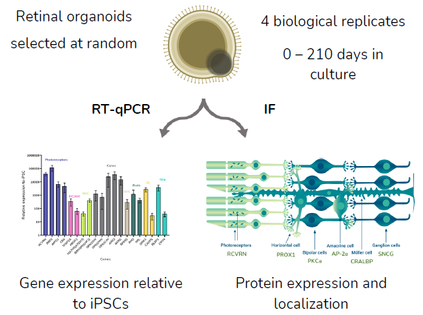 This study analyzed the gene and protein expression profiles of key retinal cell markers during differentiation in four batches of human iPSC-derived ROs.