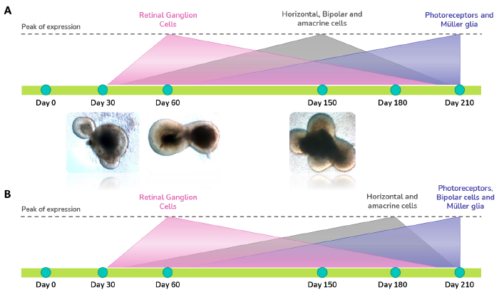 Figure 1. Photoreceptor (PR; Genes: RCVRN, RBP3, IMPG1, CRX; Protein: RCVRN), bipolar (BC; Genes: GRIK1, CADPS; Protein: PKCα), Müller glia (MG; Genes: RLBP1, CRYM; Protein: CRALBP), retinal ganglion cell (RGC; Genes: MATH5, BRN3; Protein: SNCG), horizontal and amacrine (HC/AC; Genes: PROX1, TFA2A; Protein: PROX1, AP2α), Cone PR (Genes: OPN1SW, OPN1MW, OPN1LW, ARR3, RXRG; Protein: OPN1MW/LW) and Rod PR (Gene: RHO, NRL; Protein: RHO) cell markers are expressed at different times throughout RO development which resembles in vivo development. (A) Gene expression and (B) protein expression of RGC markers peak between day 30-90, when PR progenitor cells start differentiating. Expression of cone and rod PRs initiate from day 120 and achieve highest expression and maturation levels after 210 days in culture. Image Credit: Newcells Biotech