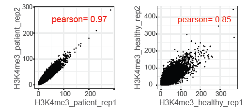 Method precision: Replicate correlations of mean H3K4me3 signal (RPGC-normalized) over TSSs in plasma samples from a cancer patient (left) and a healthy donor (right). Each replicate from 0.5 ml plasma. Image Credit: Image courtesy of Banushee Kumar et al., in partnership with ELRIG (UK) Ltd.