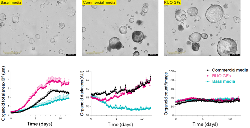 - Media containing Sartorius RUO Growth Factors and Cytokines (RUO GFs) resulted in faster growth of organoids compared to basal or commercial media.