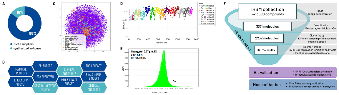 The IRBM compound collection comprises ~ 413,000 compounds, carefully curated from diverse sources, including niche and mainstream suppliers, as well as those synthesized in-house (A).