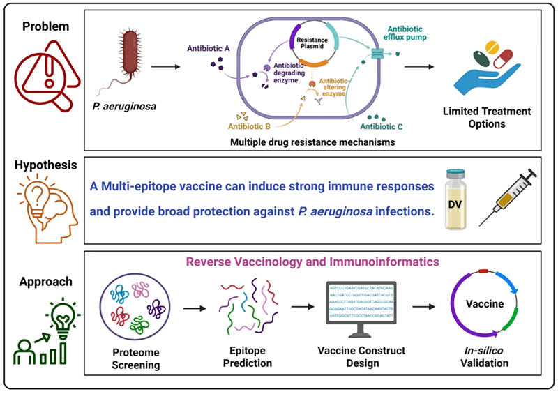 Pseudomonas aeruginosa, a WHO-designated multidrug-resistant pathogen, causes severe hospital infections. With no vaccine against it, this study aims to design a multi-epitope vaccine to prevent infections caused by P. aeruginosa using reverse vaccinology and immunoinformatics.