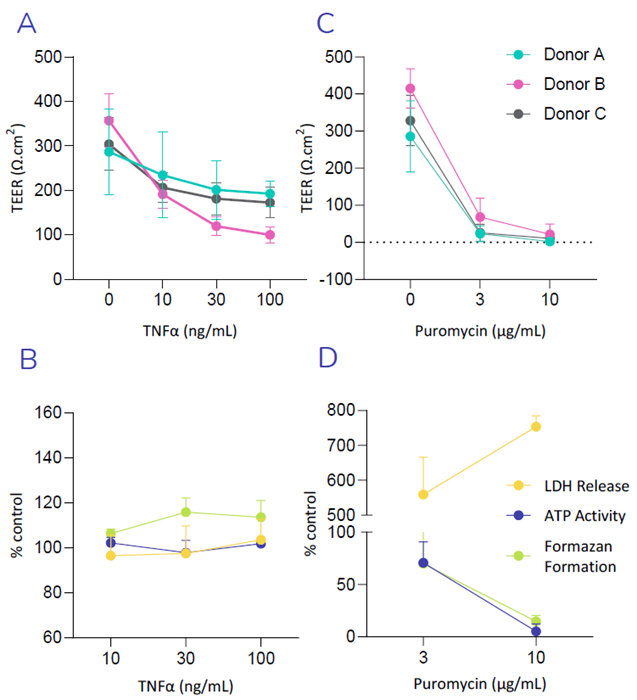 (A) Exposure of Small Airway Epithelial Cells (SAEC’s) to increasing concentration of the TNFα reduces TEER, in-line with cytokine induced breakdown of the epithelial barrier. (B) No significant increase in LDH release or decrease in ATP- or MTT- activity (formazan formation), was observed following exposure of SAEC’s to TNFα, suggesting TNFα induced breakdown of the epithelial barrier was not observed as a result of cellular toxicity. (C) Puromycin, an antibiotic with known toxic side effects in the lung, was used as a positive control. A decrease in TEER is triggered with increasing concentrations of Puromycin, indicating a loss in barrier integrity. (D) High increase in LDH release as well as a decrease in ATP- and MTT- activity was observed following exposure of SAEC’s to Puromycin, indicating drug induced cellular toxicity