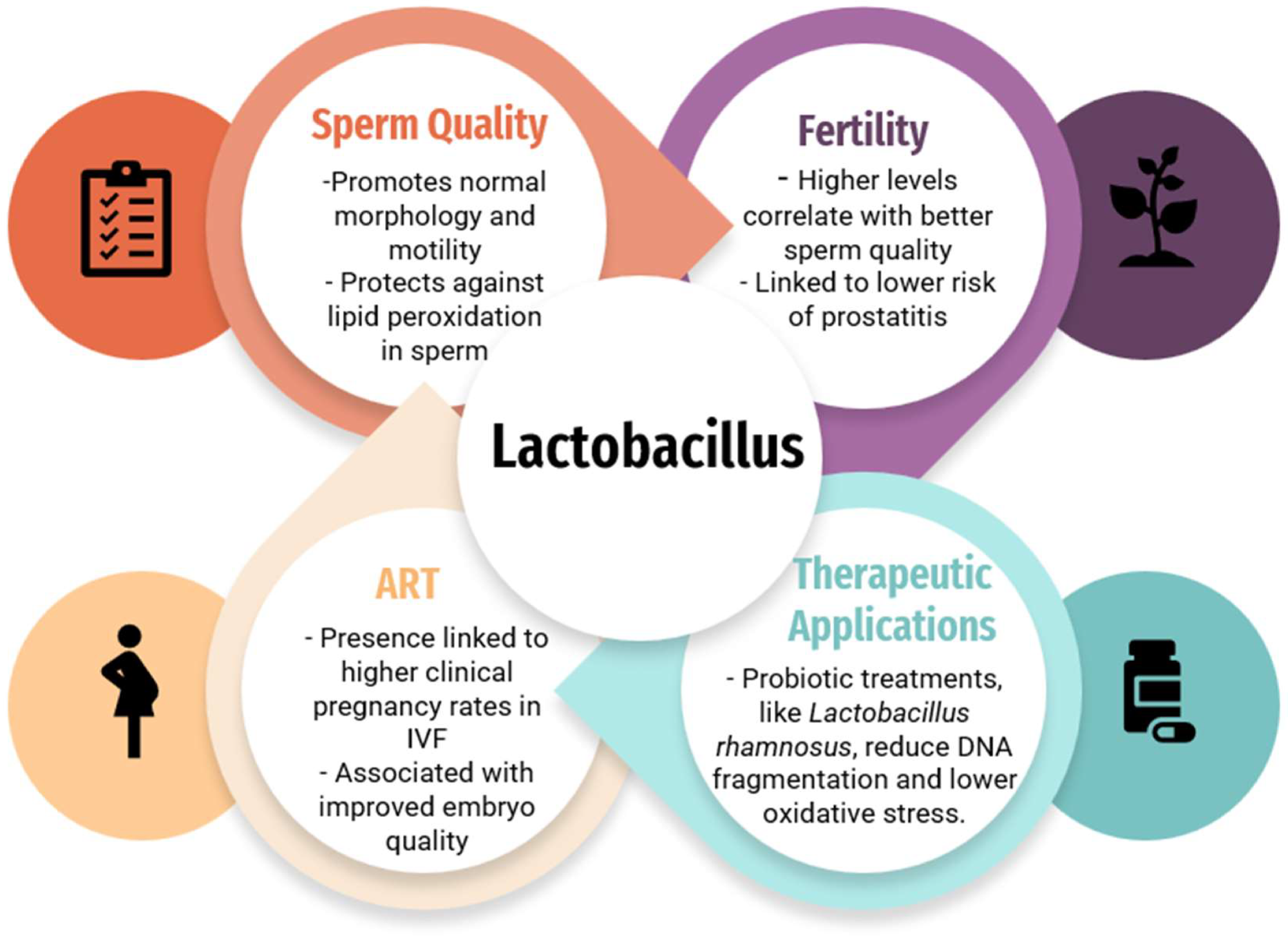 The impact of the Lactobacillus species on fertility, sperm quality, and ART outcomes, and therapeutic applications of the Lactobacillus species.3