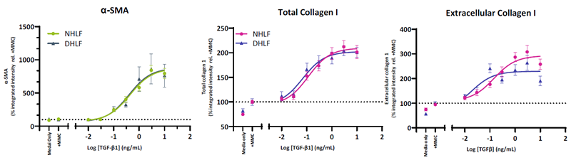 Figure 3. HLF from both normal and IPF donors demonstrate a TGF-β1 driven increase in FMT markers. Collagen 1 is increased in both the intracellular and extracellular compartments whilst α-SMA incorporation into stress fibres is indicative of fibroblast activation. HLF from normal (NHLF) and diseased (DHLF) donors were seeded into 384 well plates. The following day cells were stimulated with TGF-β1 dose response prepared in assay media then cultured for 72 hours. Cells were fixed and immunostained for collagen I (total and extracellular) and α-SMA. Shown is the total integrated intensity normalized to cell number expressed relative to the media control combined for N=3 NHLF and N=2 DHLF donors. Image Credit: Newcells Biotech