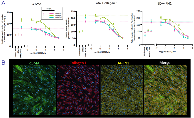 Figure 4. Multiplexed detection and quantification of fibrosis proteins including EDA-variant of Fibronectin (EDA-FN1)* Normal HLF (N=3 donors) were seeded into 384 well plates. Cells were pre-treated for 1 hour ± SB525334 over 7-point dose-response prepared in assay media, then stimulated with TGF-β1 and cultured for 72 hours. Cells were fixed then multiplexed staining for α-SMA, total collagen 1 and EDA-fibronectin was performed. Quantification showing % change in total integrated intensity relative to the vehicle control (A) and representative images of stained FMT markers in TGF-β1 stimulated cells (B). Dashed line represent TGF-β1 spiked vehicle control. Error bars represent ±SEM. n=2 experimental repeats, n=12 technical replicates. Image Credit: Newcells Biotech