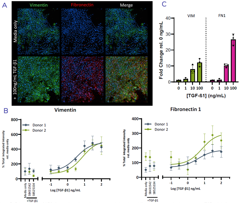 Figure 5. Primary human SAEC show a dose-dependent increase of vimentin and fibronectin expression in response to TGF- β1, indicative of a shift towards a mesenchymal phenotype. SAEC were seeded into plates and cultured until ~80% confluent. Cells were then stimulated with increasing concentrations of TGF-β1 (or co-treated with inhibitory compounds 10 μM SB431542 / SB525334) for 72 hours. Cells were either fixed and stained for EMT markers vimentin and fibronectin (A&B) or the RNA collected for RT-qPCR analysis (C). Representative images of vimentin and fibronectin staining and quantification showing % change in total integrated intensity relative to the media only control. Error bars represent ±SD. n=2 experimental repeats, n=6 technical replicates. Image Credit: Newcells Biotech