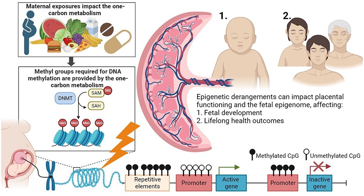 One-carbon metabolism as an underlying pathway affecting placental DNA methylation and lifelong health outcomes in offspring. Maternal exposures, such as nutrition and the use of vitamin supplements, are involved in one-carbon metabolism, which provides methyl groups for DNA methylation processes (left). DNA methyltransferases (DNMTs) transfer methyl groups to the cytosine-phosphate-guanine (CpG) sites. Derangement of the one-carbon metabolism is proposed as a mechanism affecting DNA methylation processes (bottom). The placenta is the intermediate between the maternal environment and embryonic and foetal growth and development. Epigenetic derangements can affect (1) directly the functioning of the placenta and subsequently foetal growth and development, and (2) the foetal epigenome with potential consequences for foetal growth and development, and 1 and 2 both have consequences for lifelong health outcomes in the offspring.4