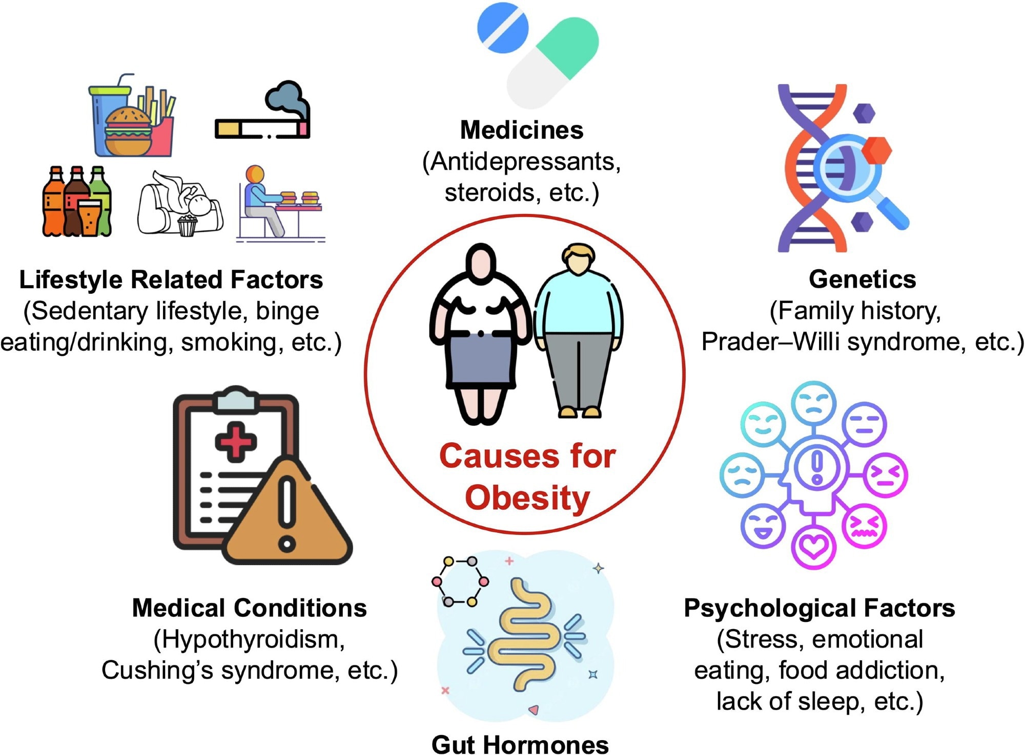 Obesity is a complex, multifactorial condition influenced by various interrelated factors, including lifestyle, medications, genetics, medical conditions, gut hormones and psychological aspects. This illustration emphasizes the intricate nature of obesity and highlights the necessity for comprehensive strategies in treatment and prevention.1