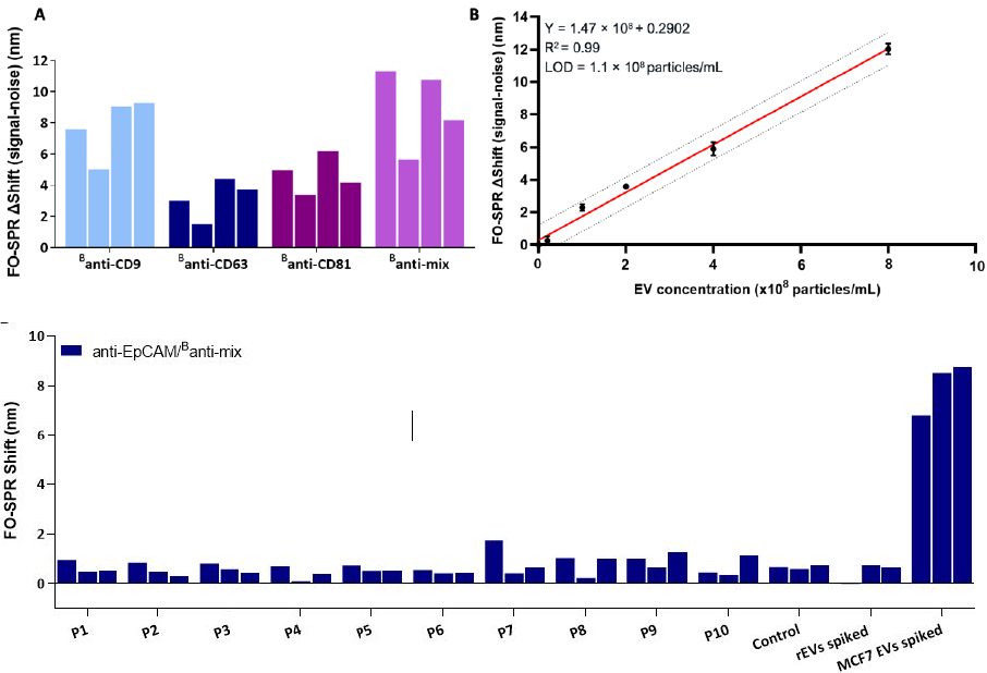 Figure 3. Detection of Breast cancer specific EVs in blood plasma. (A) FO-SPR sandwich bioassay with different antibody combinations for detecting spiked MCF7 EVs in 100-fold diluted pooled plasma. Bar graphs represent the FO-SPR shifts (after subtracting the negative control, i.e., SPR signal for 0 particles/mL) obtained from four independent measurements by combining anti-EpCAM capture antibody with different detection antibodies (Banti-CD9, Banti-CD63, Banti-CD81 or Banti-mix) for detecting MCF7 EVs at 1 × 109 particles/mL concentration. (B) FO-SPR-based detection of a series of MCF7 EV concentrations when using anti-EpCAM/Banti-mix antibody combination in spiked 100-fold diluted pooled plasma (obtained after sub- tracting the negative control, i.e., SPR signal for 0 particles/mL). Simple linear regression fitting was performed by GraphPad Prism software. The dotted lines indicate the 95% prediction bands for a new observation. Error bars represent one standard deviation (n = 3). (C) Specificity testing of the FO-SPR bioassays in 100-fold diluted plasma using anti-EpCAM/Banti-mix antibody combinations. P1 to 10 are plasma samples of 10 individual healthy donors unknown to be diagnosed with breast cancer. Control is 100-fold diluted pooled plasma. Two additional controls represent rEVs and MCF7 EVs spiked in 100-fold diluted pooled plasma. For each sample 3 independent replicate measurements were made. Specific Extracellular Vesicle detection and isolation in complex samples using FO-SPR. Adapted from (2) Yildizhan et al. (2023)