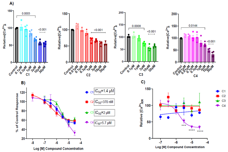 Figure 3. A) Effect of C1–C4 Compounds at different concentrations on SOCE. B) Concentration–response curves of C1-C4 showing their inhibitory effect on SOCE. C) Graph shows effect of C1-C4 on Ca2+ release from ER ([Ca2+]ER). C1–C3 showed no significant effects at any concentration, while C4 inhibited [Ca2+]ER at 3, 10 and 30 μM. Image Credit: Image courtesy of Aida Ashrafzadeh et al., in partnership with ELRIG (UK) Ltd.