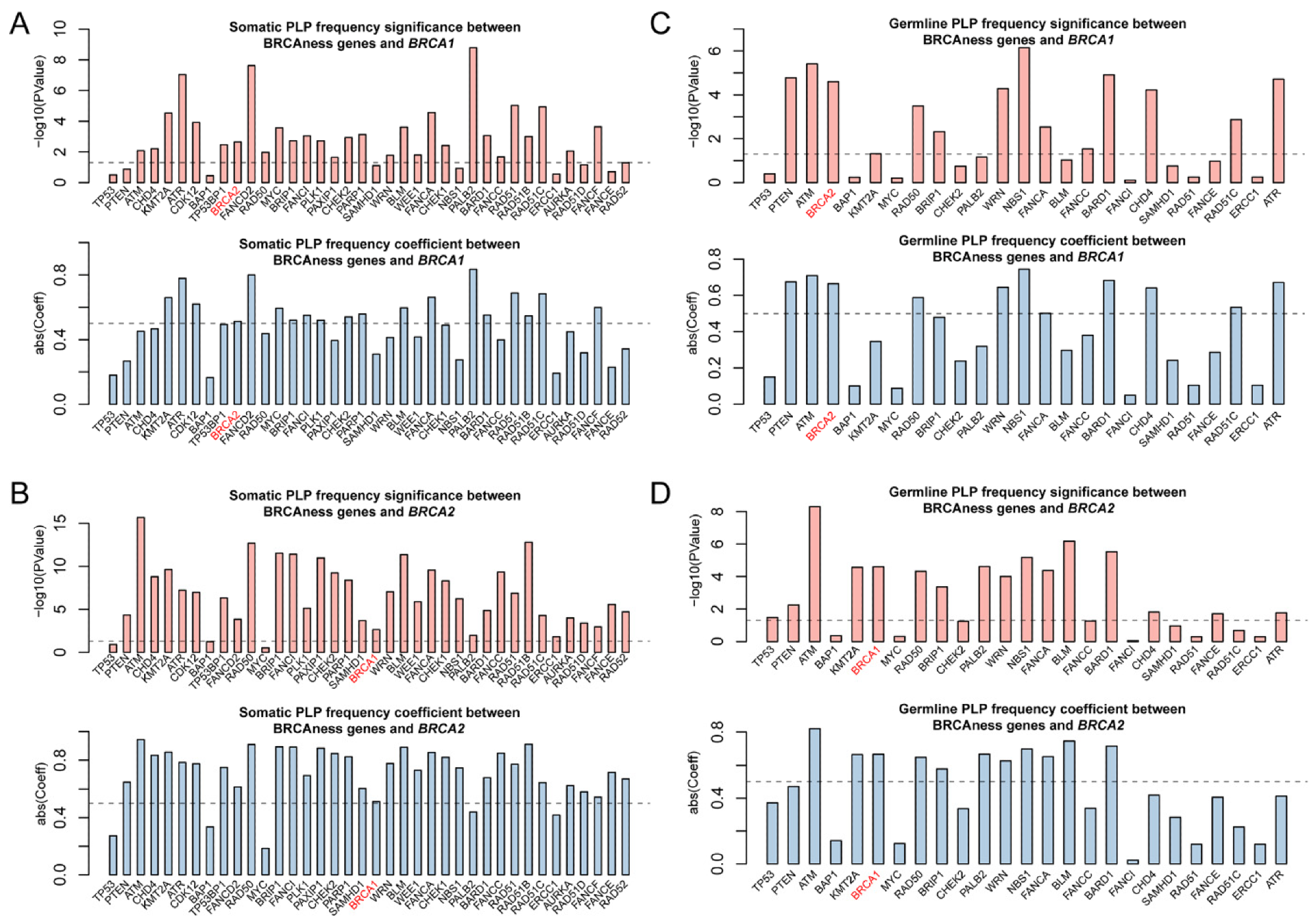 Correlation of pathogenic variation of BRCAness genes across 33 cancer types. (A,B) Significant correlation for the frequencies of somatic and germline pathogenic variants between individual BRCAness gene and BRCA1. (C,D). Significant correlation for the frequencies of somatic and germline pathogenic variants between individual BRCAness gene and BRCA2. Pairs with a p-value < 0.05 are regarded as significant. Pairs with an absolute coefficient greater than 0.5 are regarded as significantly correlated.Correlation of pathogenic variation of BRCAness genes across 33 cancer types. (A,B) Significant correlation for the frequencies of somatic and germline pathogenic variants between the individual BRCAness gene and BRCA1. (C,D). Significant correlation for the frequencies of somatic and germline pathogenic variants between the individual BRCAness gene and BRCA2. Pairs with a p-value < 0.05 are regarded as significant. Pairs with an absolute coefficient greater than 0.5 are considered as significantly correlated.2