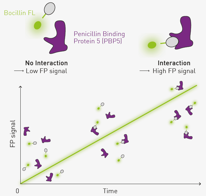 BOCILLIN FL is a fluorescent derivative of penicillin (BODIPY-labelled penicillin V). As illustrated in Figure 1, mixing of a PBP5 with BOCILLIN FL results in an increase in FP signal over time if a binding event occurs.