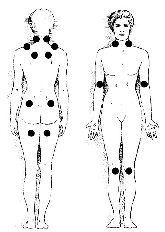 Until recently, diagnosis was based on tenderness in certain body parts, but in 2010, guidelines were updated advising that the following should be taken into account:
