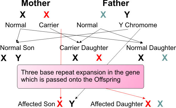 FXS is the most common cause of genetic learning disability. FXS is causes by mutations (faults) to a gene on the X chromosome (FMRI1). In this mutation, patients can have up to 200 or more repeated expansions of CGG, whereas the normal population would have no more than 40 repeats. This repeat expansion silences the gene rendering it functionless. As a consequence, normal brain development is impacted i.e. the ability for neural connections through synaptic plasticity is impaired.
