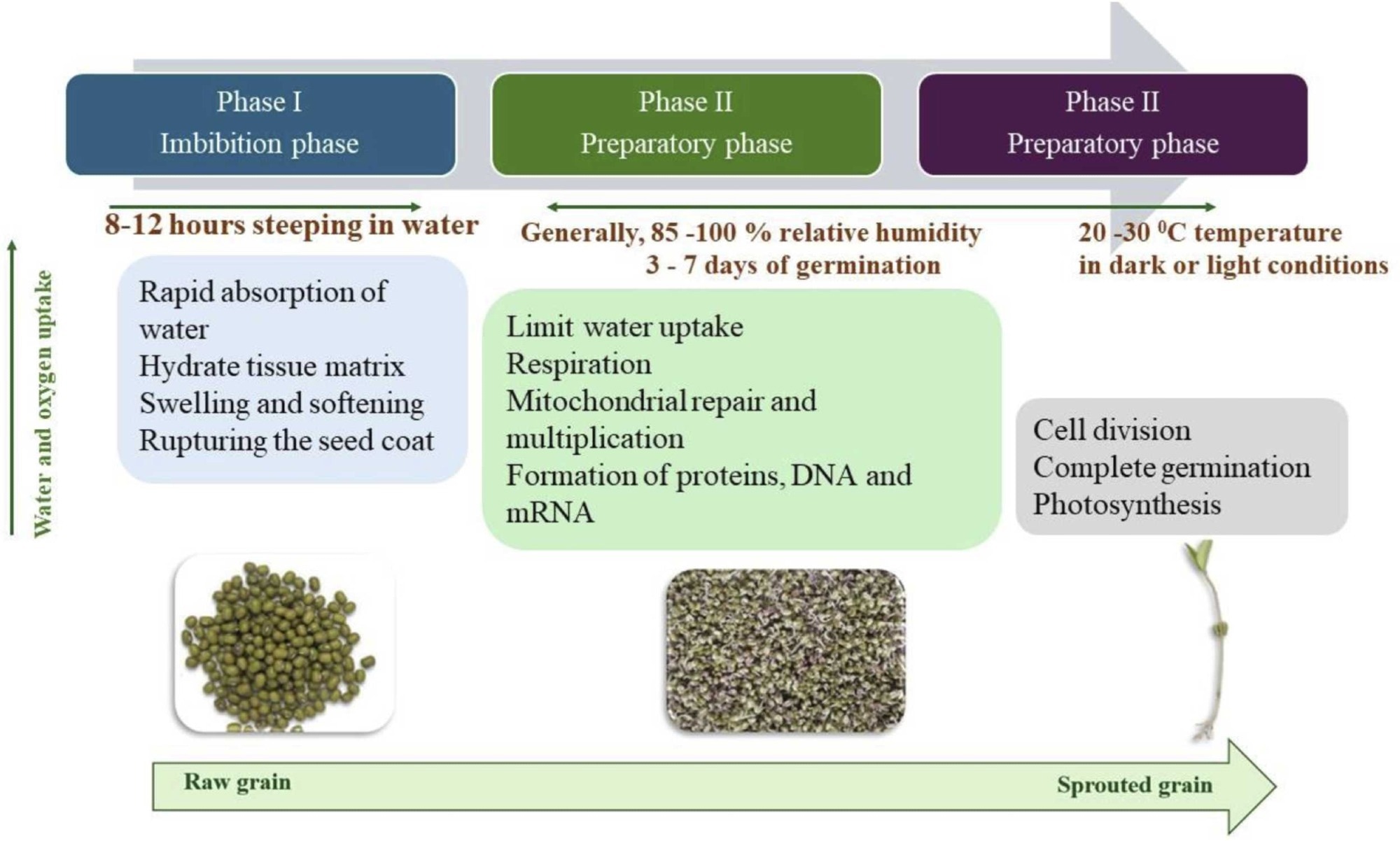 During early germination, water uptake activates metabolic pathways that stimulate the production of hydrolytic enzymes like α- and β-amylase, proteases, lipase, and phytase. These endogenous enzymes progressively degrade antinutrients such as tannins, phytic acid, lectins, α-galactosides, and protease inhibitors, thereby improving the bioavailability of crucial macromolecules in a species- and time-dependent manner.2