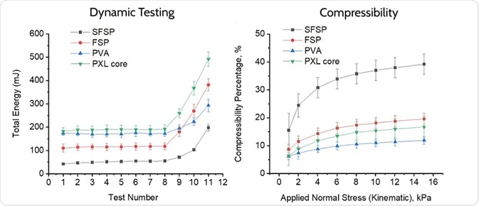 Table 1 shows particle size distribution data measured by laser diffraction (Mastersizer 2000, Malvern Instruments, UK) for each of the four powders: SFSP, FSP, PVA, and PXL core. The two silk powders have a d(0.5), or median, particle size consistent with the quoted values for the products, confirming the much coarser particle size of the FSP. However, the data additionally highlight differences in particle size distribution as captured by d(0.1), d(0.9) and Span, where d(0.1) and d(0.9) are the diameters below which 10% and 90% of the particle population lie on the basis of volume and Span is defined as d(0.9) – d(0.1)/d(0.5). These data indicate that FSP has a wider particle size distribution than SFSP and a Span far closer to PXL core. The results also show that PVA has a much coarser particle size, d(0.5) of 50µm, than the other powders.