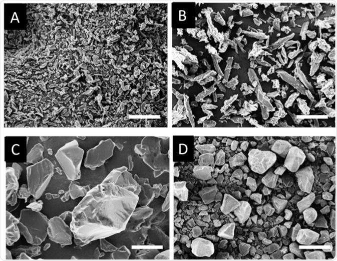 Figure 2: SEM images show the elongated morphology of silk powder particles which differs markedly from the more regular shape of PXL core [A – SFSP; B FSP; C – PVA; D- PXL core]